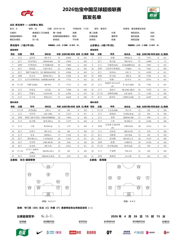 虎扑04月26日讯 北京时间今天17:00,中超联赛第8轮,青岛海牛坐镇主场迎战山东泰山,赛前双方公布首发阵容。