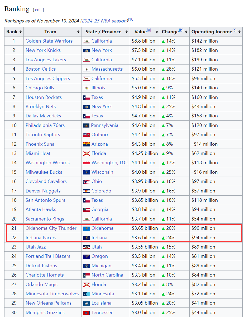 从球队市值排名榜来看,雷霆36.5亿排在联盟第21,步行者36亿排在联盟第22,这两支球队是绝对意义上的小球市。