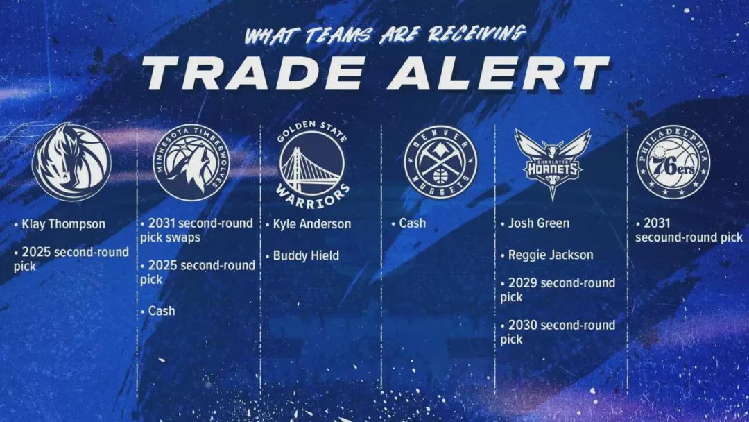 小牛拿到汤普森和2025年的次轮签,森林狼拿到2031年次轮签互换权+2025年次轮签+部分现金,勇士拿到李凯尔和希尔德,掘金拿到部分现金,黄蜂拿到约什·格林+雷吉·杰克逊+掘金的2029年和2030年次轮签,76人拿到2031年小牛的次轮签。